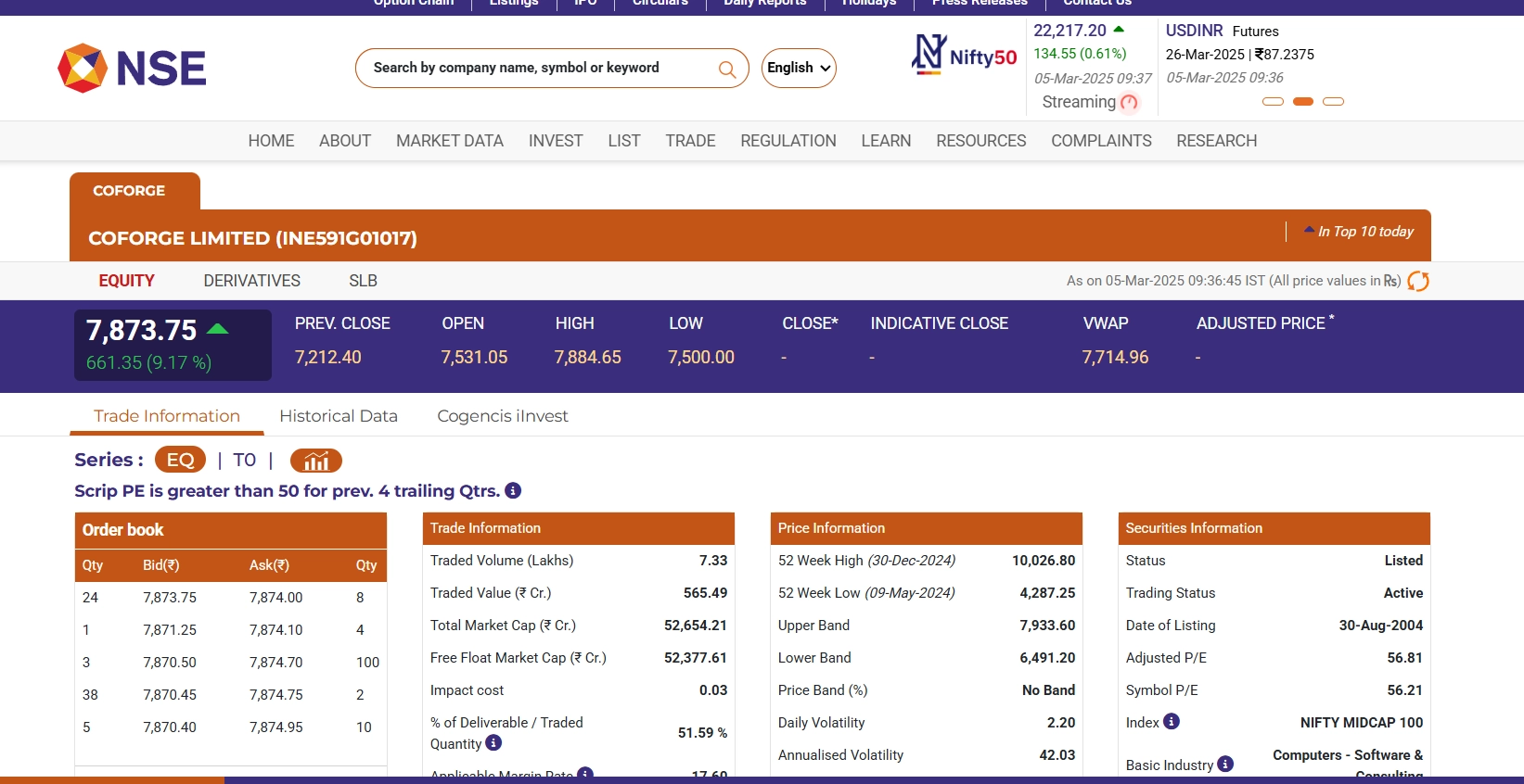 As of 9:38 AM IST on March 5, 2025, Coforge share price (NSE: Coforge) on the National Stock Exchange (NSE) surged by 9.31% to INR 7,884.00. This significant rise follows the company’s announcement of a 1:5 stock split and the acquisition of Rythmos Inc. and TMLabs Pty Ltd through its subsidiaries. Additionally, Coforge secured a $1.56 billion deal with Sabr Corp, further boosting investor confidence. On the Bombay Stock Exchange (BSE), the stock was trading at INR 7,779.95 at 9:27 AM IST, reflecting a 7.64% increase from the previous close of INR 7,228.00. These developments have positioned Coforge as a focal point in the market, attracting significant investor attention. Stocks To Buy or Sell Today, March 5, 2025: Adani Wilmar, Ola Electric Mobility, RVNL Among Shares That May Remain in Focus on Wednesday.