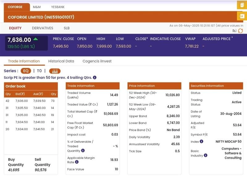 Shares of Coforge Limited (NSE: COFORGE) saw a sharp rally in early Tuesday trade, rising by 1.86% or INR 139.50 to INR 7,636 on the NSE. The rise came just a day after the company released its Q4 results and announced a dividend and stock split proposal. IT solutions company Coforge reported a 17% year-on-year (YoY) growth in its consolidated net profit to INR 261 crore for the fourth quarter of FY25, as against INR 223.7 crore in the corresponding quarter last year. M&M Share Price Today, May 06: Stocks of Mahindra and Mahindra Limited Up by 2.90%, Check Latest Price on NSE and BSE.