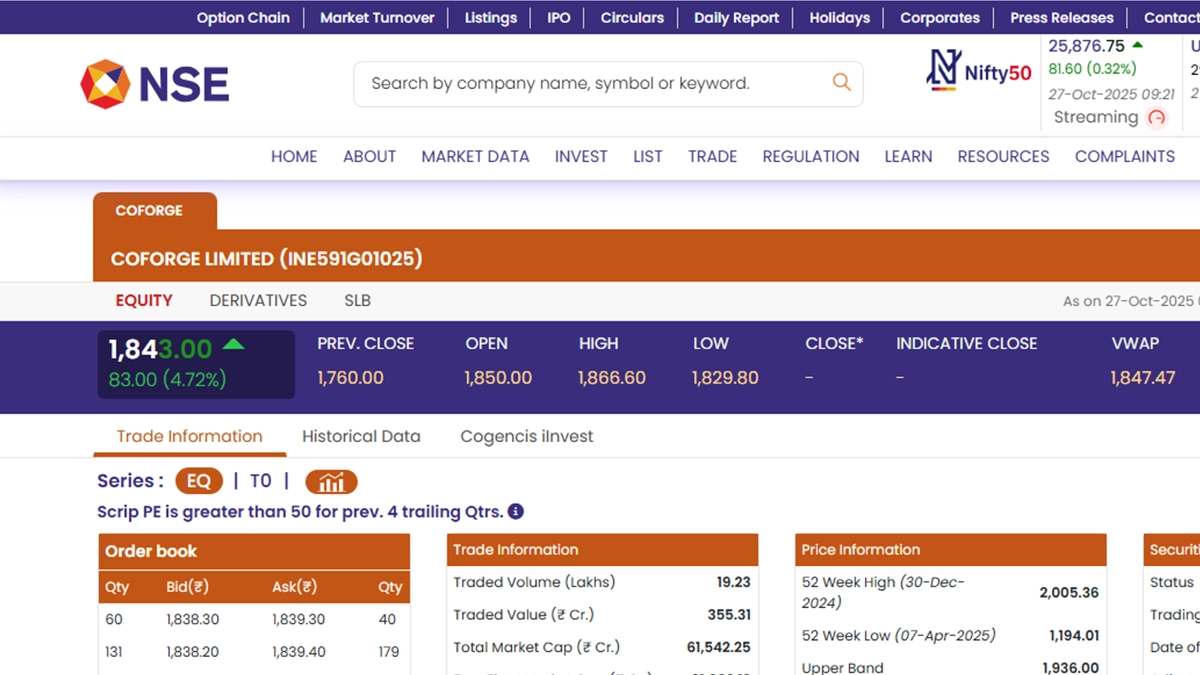 The Indian stock market opened for trading today, October 27, after remaining closed for two days over the weekend. The stocks of Coforge Limited (NSE: COFORGE) opened in green and were trading at INR 1,843. According to the National Stock Exchange (NSE) website, shares of Coforge Limited (NSE: COFORGE) rose by INR 83 in early trade. Notably, stocks of Coforge Limited (NSE: COFORGE) saw their 52-week high of INR 2,005.36 on December 30 last year and 52-week low of INR 1,194.01 on April 7 this year. Stocks to Buy or Sell Today, October 27, 2025: NTPC, Reliance Industries, and Kotak Mahindra Bank Among Shares That May Remain in Focus on Monday.