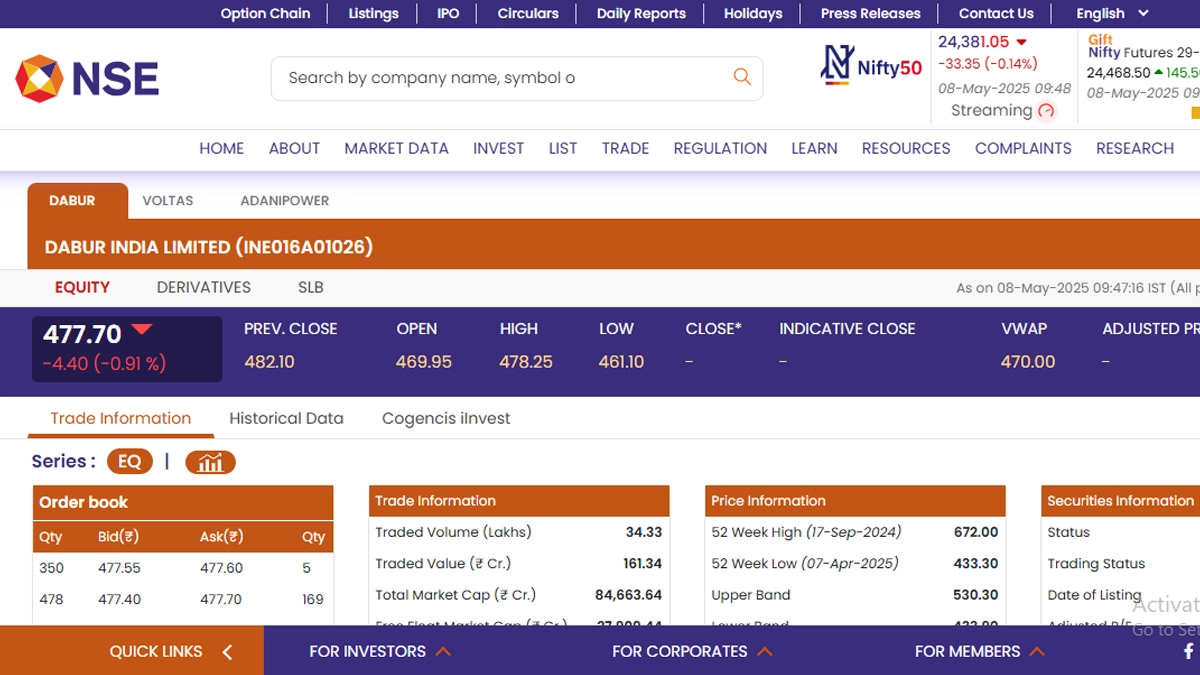 Shares of Dabur India Limited (NSE: DABUR) opened on a negative note today, May 8. According to the National Stock Exchange (NSE) website, Dabur India Limited (NSE: DABUR) stocks were trading at INR 477.70 and fell by INR 4.40 or 0.91 per cent. Notably, Dabur India Limited (NSE: DABUR) saw its 52-week high and low of INR 672 and INR 433.30 on September 17, 2024 and April 7, 2025, respectively. Voltas Share Price Today, May 8: Stocks of Voltas Limited Rise by INR 19.70 in Early Trade, Check Latest Price on NSE.