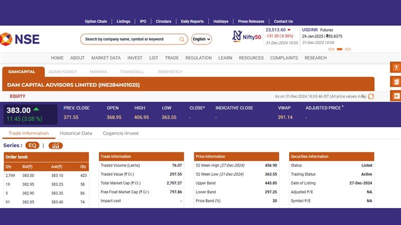 The shares of Dam Capital Advisors Limited (NSE: Dam Capital) opened in green today, December 31, in early trade. As per the latest trading updates on the National Stock Exchange (NSE), Dam Capital Advisors Limited (NSE: Dam Capital) was trading at INR 383 and saw a gain of INR 11.45 (3.08 per cent). Notably, Dam Capital Advisors Limited (NSE: Dam Capital) stock had closed at INR 371.55 during the previous day's closing. Dam Capital Advisors Limited (NSE: Dam Capital) share saw its 52-week high of INR 456.90 on December 27. On Friday, December 27, DAM Capital Advisors Limited stock had ended with a sharp premium of nearly 47 per cent against the issue price of INR 283. Stocks To Buy or Sell Today, December 31: Mazagon Dock Shipbuilders, ITC and EaseMyTrip Among Shares That May Remain in Focus on Thursday, Know Which Stocks to Buy or Sell on December 31.