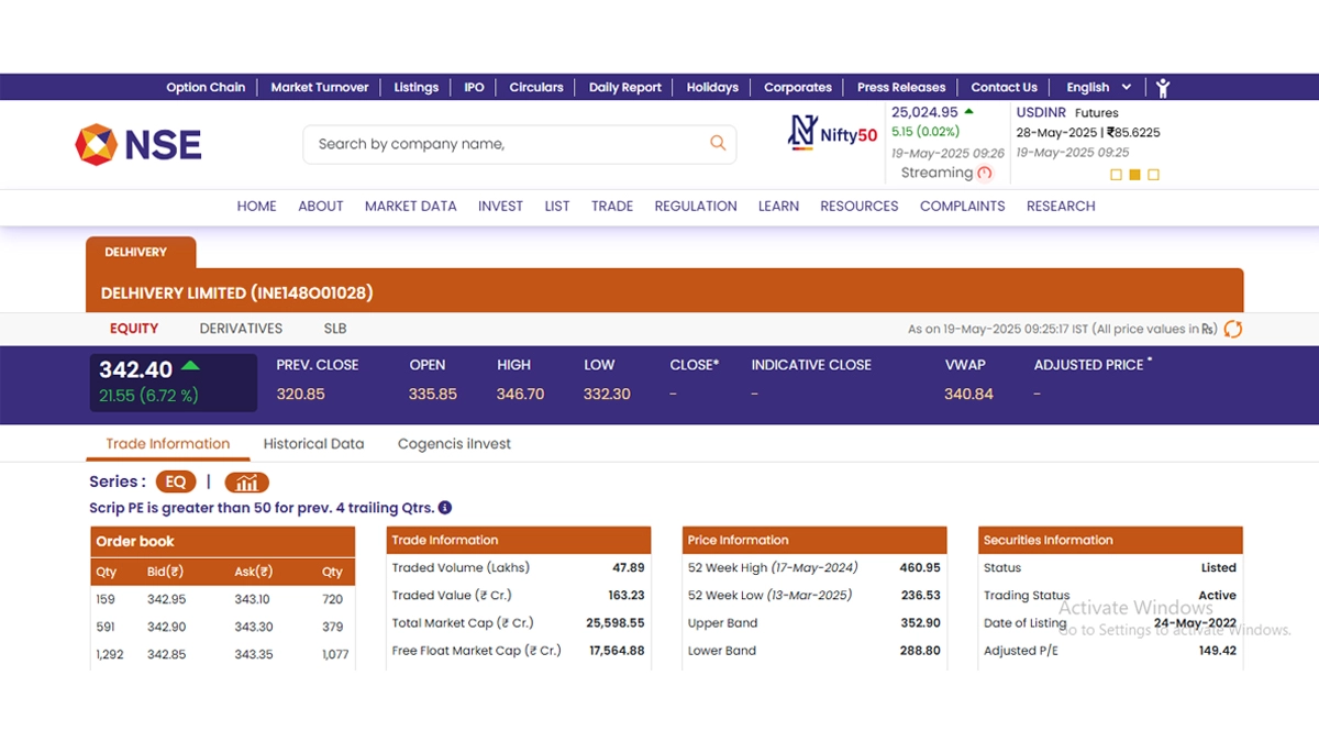 Stocks of Delhivery Limited (NSE: DELHIVERY) opened in green today, May 19, as soon as the stock market opened for business. According to the National Stock Exchange (NSE) website, shares of Delhivery Limited (NSE: DELHIVERY) were trading at INR 342.40. As per the latest share market updates, Delhivery Limited (NSE: DELHIVERY) stocks saw a rise of INR 21.55 or 6.72 per cent. Notably, Delhivery Limited (NSE: DELHIVERY) saw its 52-week high of INR 460.95 on May 17 last year. Stocks To Buy or Sell Today, May 19, 2025: Bharti Airtel, Delhivery and Hyundai Motor India Among Shares That May Remain in Spotlight on Monday.