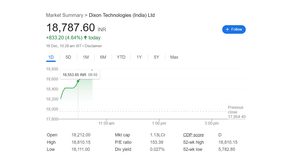 Dixon Technologies (India) Ltd (NSE: DIXON) share price opened on a positive note on December 16 and has continued to rise. At 10:36 AM, Dixon Technologies' share price was trading at INR 18,732.60 on the National Stock Exchange (NSE), reflecting a gain of INR 778.20 (+4.33%) today. The stock’s 52-week high stands at INR 18,830.00, while the 52-week low is INR 5,782.85. Investors are closely tracking the stock's movements amidst fluctuating market conditions. Stocks To Buy Today, December 16: Ganesh Dongre, Sumeet Bagadia Recommend These Shares To Buy on Monday.