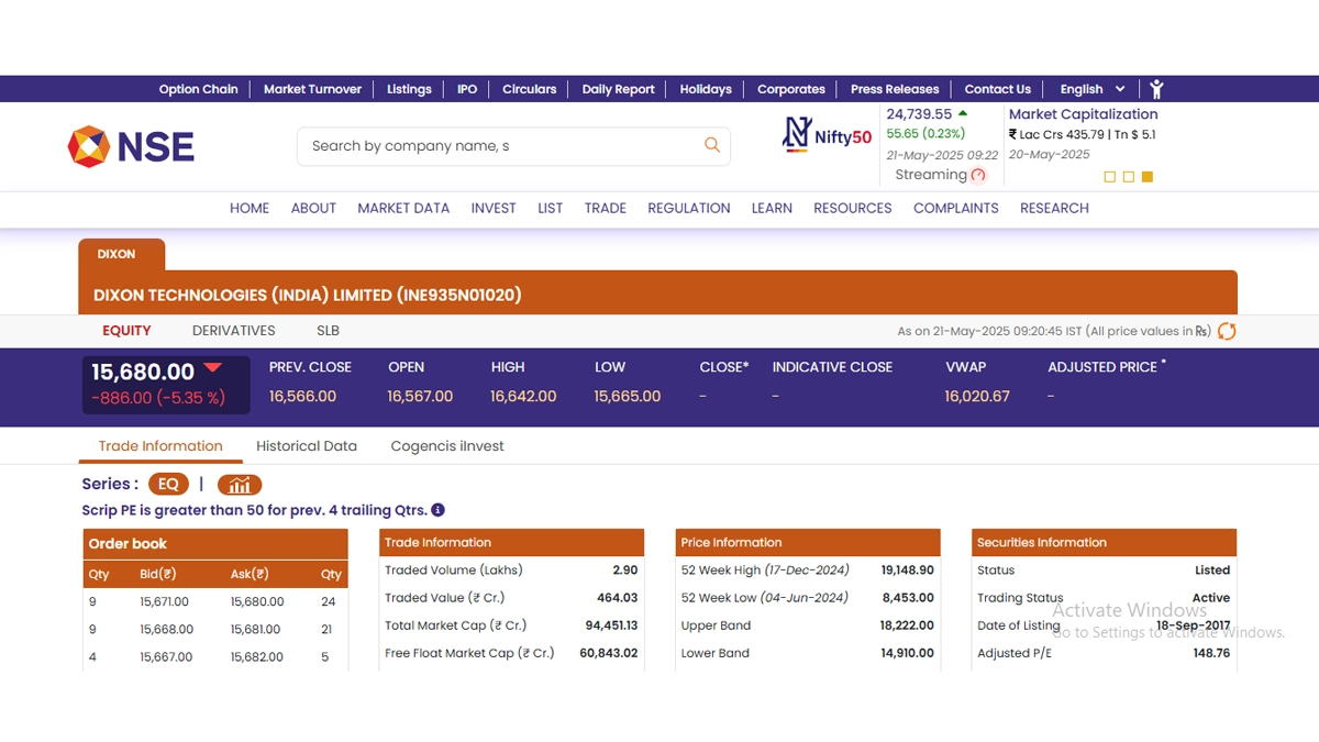 Stocks of Dixon Technologies (India) Limited (NSE: DIXON) opened in red today, May 21, soon after the stock market opened for business. According to the National Stock Exchange (NSE) website, shares of Dixon Technologies (India) Limited (NSE: DIXON) were trading at INR 15,680.00 and fell by INR 886.00 or 5.35 per cent. Notably, Dixon Technologies (India) Limited (NSE: DIXON) stocks saw their 52-week high of INR 19,148.90 on December 17 last year and 52-week low of INR 8,453.00 on June 4, 2024. Stocks To Buy or Sell Today, May 21, 2025: SBI, United Spirits and Whirlpool of India Among Shares That May Remain in Spotlight on Wednesday.