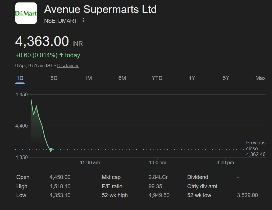 Shares of Avenue Supermarts, which operates DMart (NSE: DMart), were trading at INR 4,366.80 on April 6, 2026, up INR 4.40 or 0.10% on the NSE as of 9:51 am IST. The stock showed marginal gains in early trade, reflecting cautious investor sentiment. Despite limited movement, traders are monitoring consumption trends and retail sector cues for further direction in DMart’s share price throughout the session. Stock Market Today: Sensex, Nifty Slip After Mild Start on Geopolitical Tensions.
