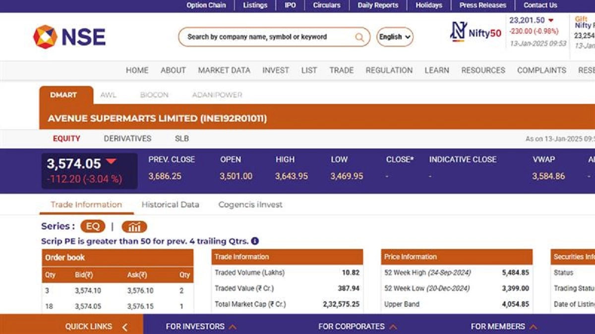 Avenue Supermarts Limited (NSE: Dmart) opened in negative today, January 13, in the early morning trade. According to the National Stock Exchange (NSE), Avenue Supermarts Limited (NSE: Dmart) stocks saw a decline of INR 112.20 or 3.04 per cent. In the previous session, the Avenue Supermarts Limited (NSE: Dmart) stock had closed at INR 3,686.25. Adani Wilmar Share Price Today, January 13: Stocks of Adani Wilmar Limited Dip 6.70% in Early Trade After Opening at INR 291.10.