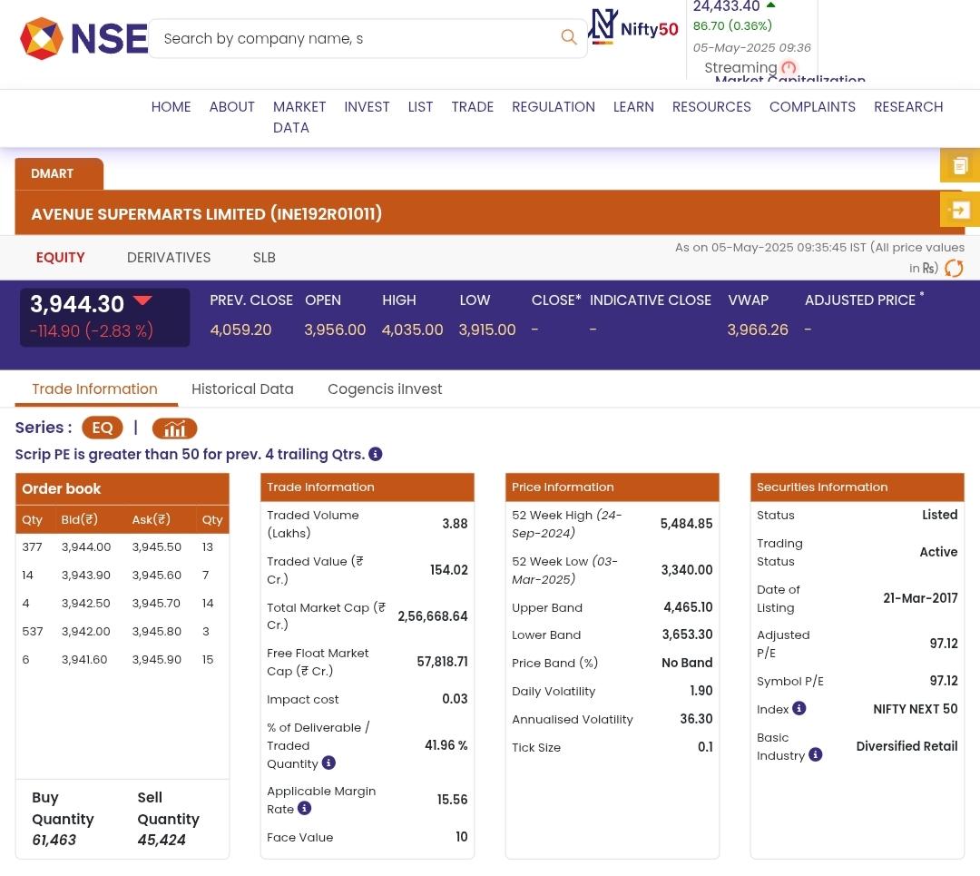 Shares of Avenue Supermarts Limited (NSE: DMART) saw a sharp drop in early Monday trade, dropping by 2.83% to INR 3,944 on the NSE. Avenue Supermarts, which operates DMart, announced its Q4 FY2025 results, showing a 2.6% year-on-year increase in standalone net profit to INR 619.71 crore. Stocks To Buy or Sell Today, May 05, 2025: DMart, Tata Motors, JSW Steel and Sunteck Realty Among Shares That May Remain in Focus on Monday.