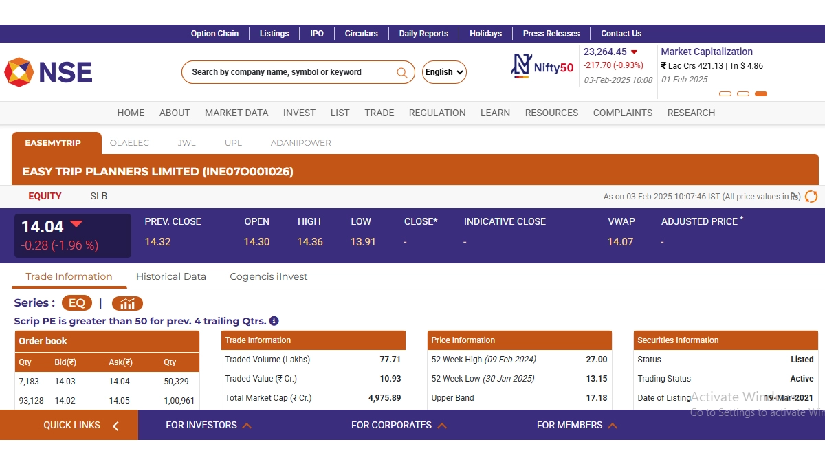 Easy Trip Planners Limited (NSE: Easemytrip) stocks opened on a negative note today, February 3. During the early moring trade on the National Stock Exchange (NSE), shares of Easy Trip Planners Limited (NSE: Easemytrip) were trading at INR 14.04 and fell by INR 0.28 or 1.96 per cent. It must be noted that Easy Trip Planners Limited (NSE: Easemytrip) saw its 52-week high of INR 27 on February 9 last year. IRCON Share Price Today, February 3: Ircon International Stock Drops 5.42% After Budget 2025, Check Stock Price on NSE and BSE.