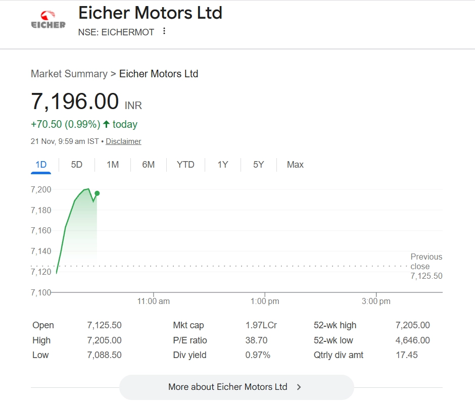 Eicher Motors share price (NSE: EICHERMOT) traded at INR 7,197.50 on the NSE at 10:00 am IST, up INR 72.00 or 1.01% from the previous close. The stock opened on a positive note, reflecting steady investor confidence driven by strong demand for Royal Enfield motorcycles and stable quarterly performance. Market analysts suggest that the company’s robust export outlook and continued domestic growth are supporting sentiment. Eicher Motors remains one of the key players in the premium motorcycle segment, and its consistent financials continue to attract long-term investors. Stocks to Buy or Sell Today, November 21: TCS, Reliance Industries Limited, and Hyundai Motor Among Shares That May Remain in Spotlight on Friday.
