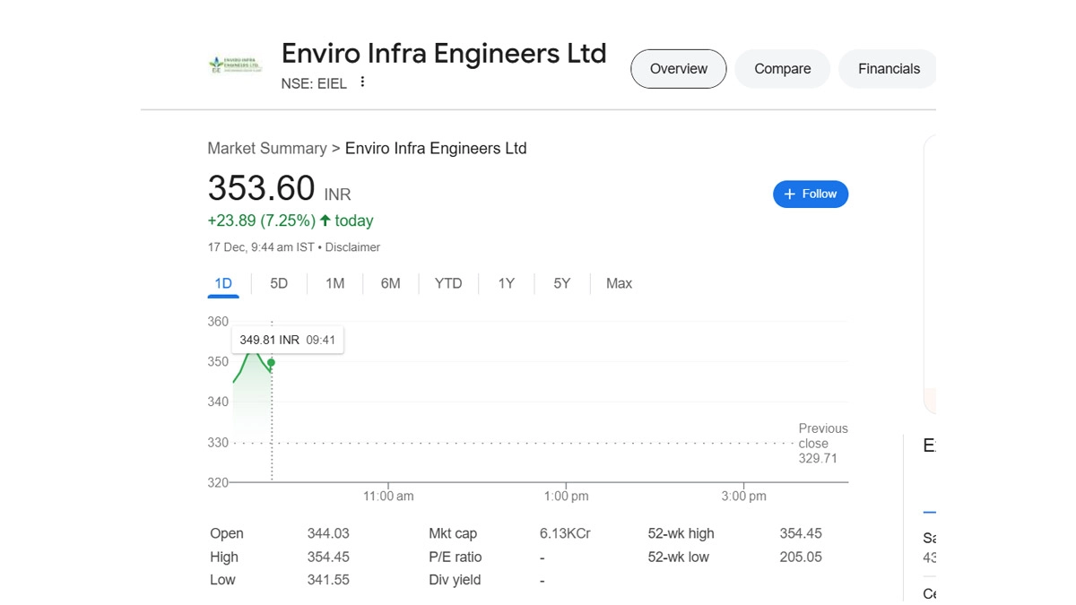 Shares of Enviro Infra Engineers Ltd. (NSE: EIEL) rose by 6.1%, reaching INR 349.81 as of 9:41 AM IST on December 17. The stock showed a strong upward movement throughout the morning, peaking at INR 354.45, while the lowest point of the day was INR 341.55. With a market capitalization of INR 6.13K Crore, the company has remained resilient despite market fluctuations. The stock's performance is noteworthy, especially in light of its 52-week high of INR 354.45 and a low of INR 205.05. Stocks To Buy Today, December 17: Kalyan Jewellers, Prestige Estates, Oberoi Realty Among Recommended Shares To Buy on Tuesday.