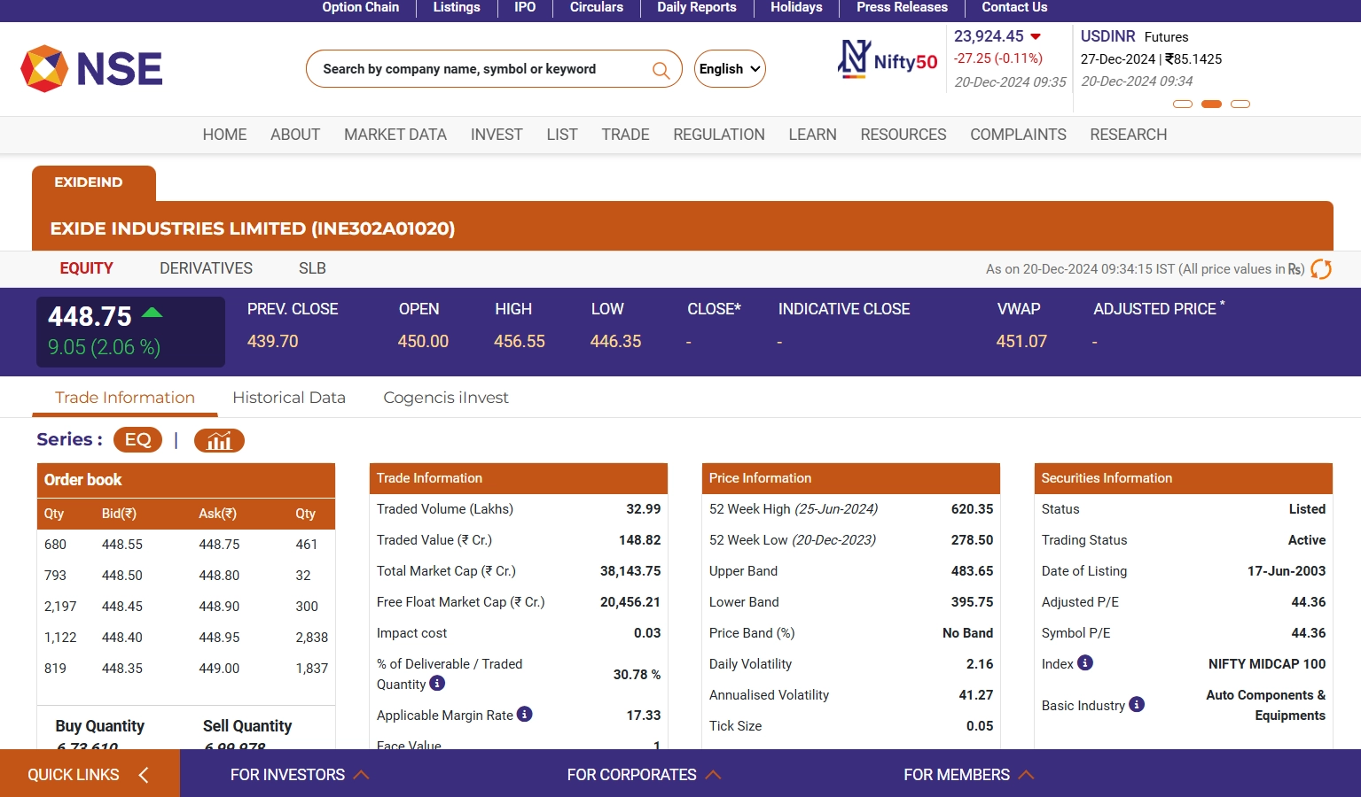 Exide Industries’ share price (NSE: ExideIND) rose by 2.06% on December 20, trading at INR 448.75 at 9:35 AM. Over the past year, the stock has surged by 52.99%, peaking at INR 453.25. In comparison, the Nifty index increased by 11.65% during the same period, reaching 23,951.70. The strong performance of Exide Industries share price (NSE: ExideInd) highlights its significant growth compared to the broader market. Investors continue to show confidence in the stock, with its steady rise reflecting robust business prospects and market demand in the battery and energy sector. Stocks To Buy or Sell Today, December 20: Bharti Airtel, Asian Paints, Axis Bank Among Shares That May Remain in Focus on FridayKnow Which Stocks to Buy or Sell on December 20.