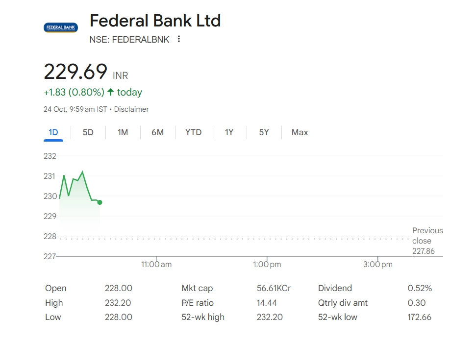Federal Bank Ltd (NSE: FEDERALBNK) saw its share price rise on Friday, October 24, following the announcement of a preferential issue of convertible warrants. The stock was trading at 229.57 INR, up 0.75% from the previous close. The bank approved the issuance of 27.29 crore warrants to Asia II Topco XIII, an affiliate of private equity firm Blackstone, with each warrant giving the right to subscribe to one fully paid-up equity share at 227 INR. Investors reacted positively, as the warrant price is nearly in line with Thursday’s closing price, signaling confidence in the transaction. Stocks To Buy or Sell Today, October 24, 2025: Tata Motors, Sagar Cements and Hero MotoCorp Among Shares That May Remain in Spotlight on Friday.
