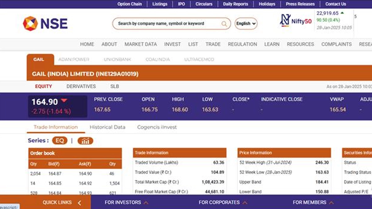 Gail India Limited (NSE: Gail) stocks opened in red today, January 28, in early morning trade. According to the National Stock Exchange (NSE) website, Gail India Limited (NSE: Gail) shares were trading at INR 164.90 and fell by INR 2.75 or 1.64 per cent. Notably, Gail India Limited (NSE: Gail) stocks saw their 52-week high of INR 246.30 on July 31 last year. Union Bank Share Price Today, January 28: Stocks of Union Bank of India Open in Green in Early Trade, Surge by 2.90%.