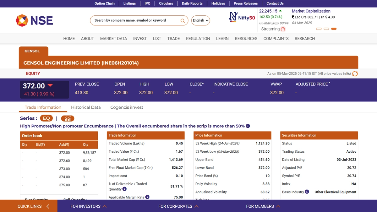 Shares of Gensol Engineering Ltd (NSE: GENSOL) opened at INR 372.00 today, reflecting a significant decline of 9.99 per cent, down by INR 41.30 from its previous close of INR 413.30. This drop follows a sharp 20 per cent fall on March 4, triggered by a downgrade in its long-term and short-term bank facilities by CARE Ratings. The agency downgraded Gensol's long-term facilities worth INR 639.7 crore to CARE D from CARE BB+, citing delays in servicing term loan obligations. The revised ratings also impacted other facilities, further straining investor confidence. Coforge Share Price Today, March 5: Check Coforge Limited Stock Prices on NSE and BSE.