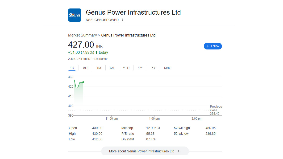 Genus Power Infrastructures Ltd (NSE: GENUSPOWER) saw a strong rise in its share price on the NSE, climbing INR 31.60 or 7.99% to trade at INR 427.00 as of 9:41 am IST. The stock opened at INR 430.00, touched a high of INR 430.00, and went down to a low of INR 412.00 during early trade. With this surge, the company’s market capitalisation has reached around INR 12,900 crore. The stock is currently trading close to its 52-week high of INR 486.05, and has significantly moved up from its 52-week low of INR 236.85. MMTC Share Price Today, June 2: Stocks of MMTC Limited Fall by 6.03% in Early Trade, Check Latest Price on NSE.