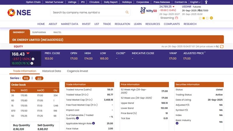Shares of GK Energy Limited (NSE: GKENERGY) made a strong debut on Friday, September 26, opening at INR 171 on the NSE, a premium of 11.76% over its IPO issue price of INR 153. By 10:10 AM, the stock was trading at INR 168.43, down 1.50% in early trade. The INR 464.26 crore IPO, comprising a fresh issue of INR 400 crore and an offer for sale of INR 64.26 crore, was subscribed 93.6 times, reflecting strong investor demand. GK Energy, a Pune-based company specialising in EPC services for renewable energy projects, had set its fixed price band at INR 145-153 with a lot size of 98 shares. Ahead of the IPO, the company raised INR 139 crore from anchor investors, including Pinebridge and Prashant Jain's 3P India Equity Fund. A total of 91.03 lakh shares were allotted at the upper price band to marquee domestic and global institutions. Sun Pharma Share Price Today, September 26: Sun Pharma Stock Falls Over 2% After US Announces 100% Tariff on Branded Drug Imports, Check Latest Price on NSE.
