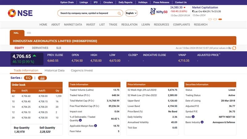 Hindustan Aeronautics Ltd. (NSE: HAL) saw a notable increase in its share price on December 13, climbing by over 1 per cent following the announcement of a major deal with the Ministry of Defence (MoD). The stock opened at INR 4,754.50 on the National Stock Exchange (NSE), up from its previous close of INR 4,660.55. The boost in HAL's share price comes after the defence giant secured a contract worth INR 13,500 crore to supply 12 Su-30MKI aircraft to the Indian Air Force. This deal is expected to bolster India's defence capabilities and align with the government's Aatmanirbhar Bharat initiative. PropShare Platina REIT Share Price: Property Share SM REIT Overtakes Elcid, MRF To Become India's Most Expensive Security With INR 10.45 Lakh Price Tag.