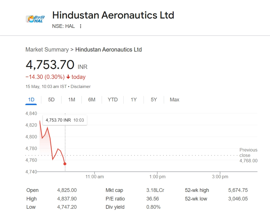 Hindustan Aeronautics Ltd (HAL) share price (NSE: HAL) saw a slight dip in early trading on May 15, with its share price declining by 0.30% to INR 4,753.70 on the NSE at 10:03 am. The stock fell INR 14.30 from its previous close amid mild profit booking after recent highs. Despite the minor setback, investor sentiment around HAL remains strong due to its dominant position in India’s defence manufacturing sector and continued order inflows from the armed forces. Stocks To Buy or Sell Today, May 15, 2025: Eicher Motors, Apollo Tyres, Sanofi India and Tata Power Among Shares That May Remain in Focus on Thursday.