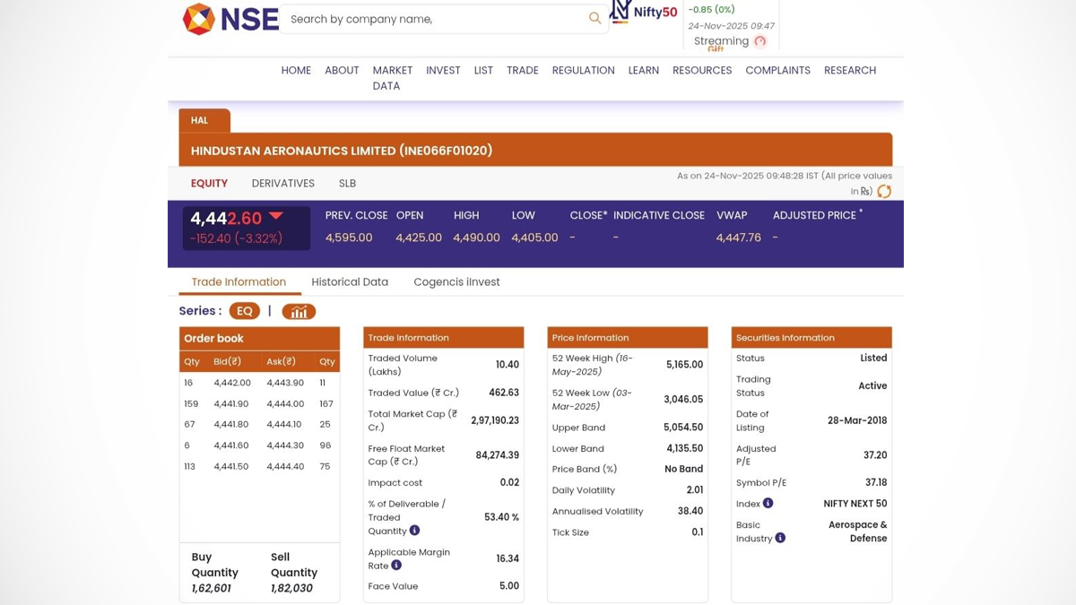 The shares of Hindustan Aeronautics (HAL) (NSE: HAL) dropped by over 3 percent in the early trading hours of Monday, November 24, after a Tejas fighter jet manufactured by the Indian PSU company crashed during a Dubai Air Show on November 21, causing the death of an IAF officer. HAL shares were trading at INR 4,442 apiece on November 24, the lowest level seen by the stock in more than 10 weeks. Stocks to Buy or Sell Today, November 24, 2025: Tata Power, RVNL and Lemon Tree Hotels Among Shares That May Remain in Focus on Monday.