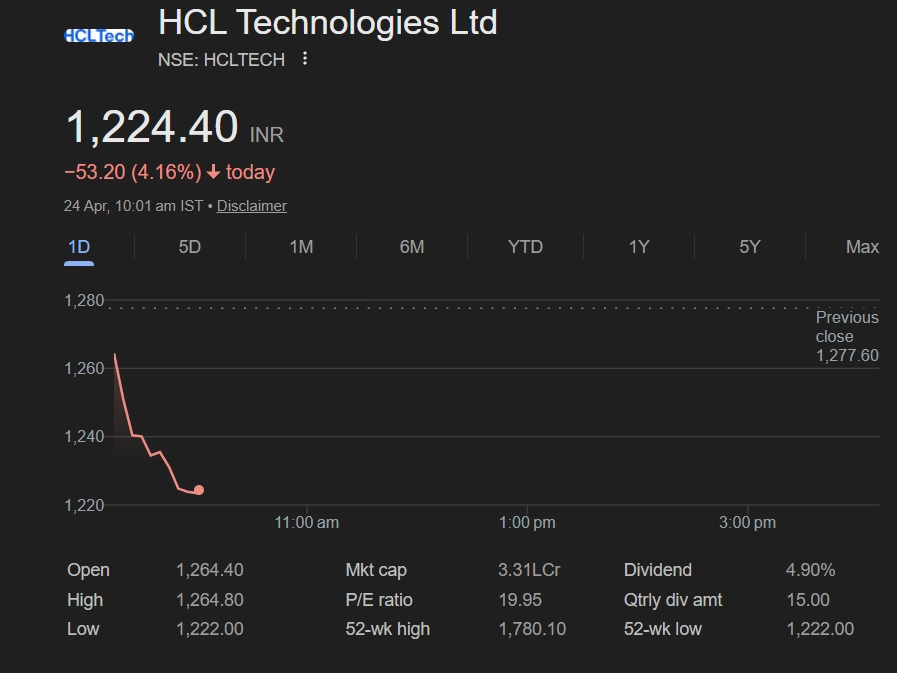 Shares of HCL Technologies Ltd (NSE: HCLTech) declined sharply on April 24, 2026, falling 4.16% in early trade. The stock was trading at INR 1,224.40, down INR 53.20 as of 10:02 am IST. The drop comes amid broader weakness in the IT sector, with investors turning cautious due to global uncertainties and muted demand outlook. HCLTech, a key player in India’s IT industry, has seen selling pressure alongside peers. Market experts advise investors to track sector trends, deal wins, and upcoming earnings for clearer signals on future performance. Stocks To Buy or Sell Today, April 24, 2026: Infosys, Tata Capital, and Mahindra Logistics Among Shares That May Remain in Focus on Friday.