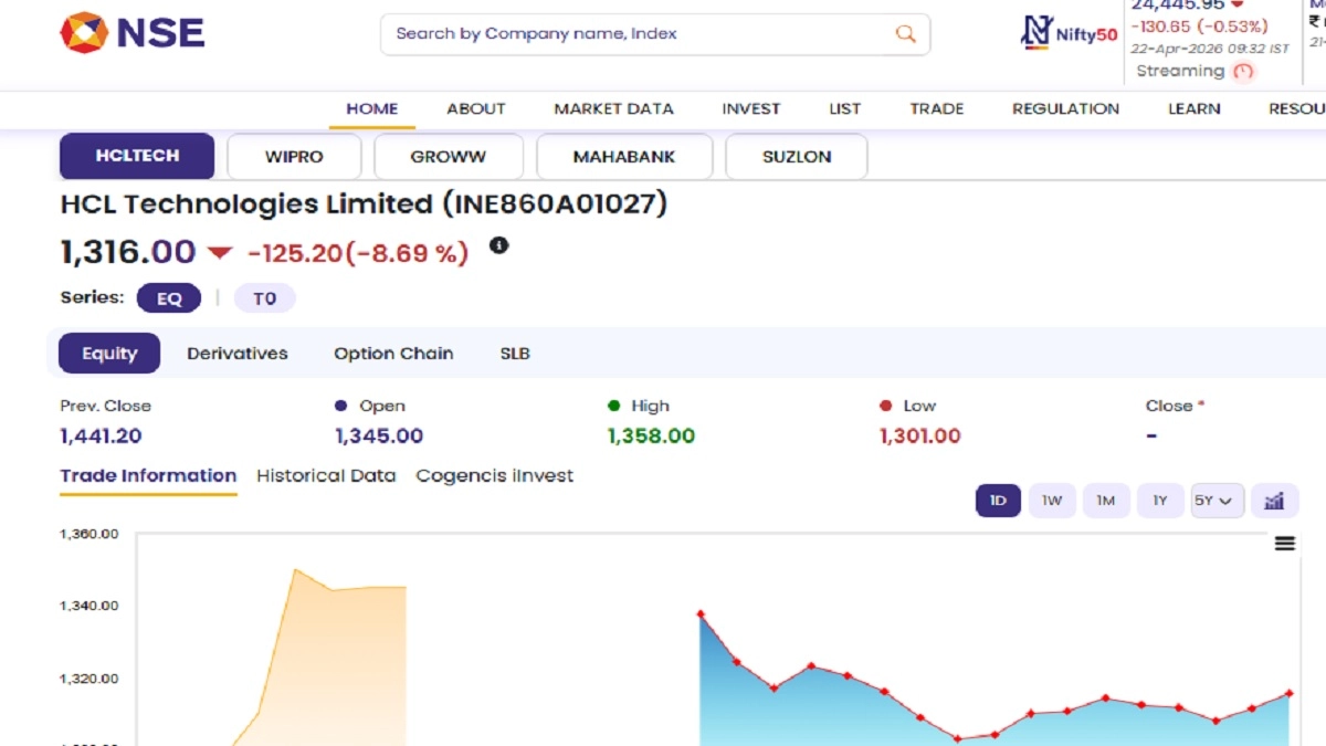 Stcosk of HCL Technologies Limited (NSE: HCLTECH) opened in the red today, April 22, as soon as the stock market opened for business. According to the National Stock Exchange (NSE) website, shares of HCL Technologies Limited (NSE: HCLTECH) were trading at INR 1.316 and fell by INR 125.20 or 8.69 per cent. Notably, HCL Technologies Limited (NSE: HCLTECH) stocks saw their 52-week high and low of INR 1,780.10 on February 3 this year and INR 1,297.70 on March 17. Stocks To Buy or Sell Today, April 22, 2026: BEML, HCL Tech, and Trent Among Shares That May Remain in Focus on Wednesday.