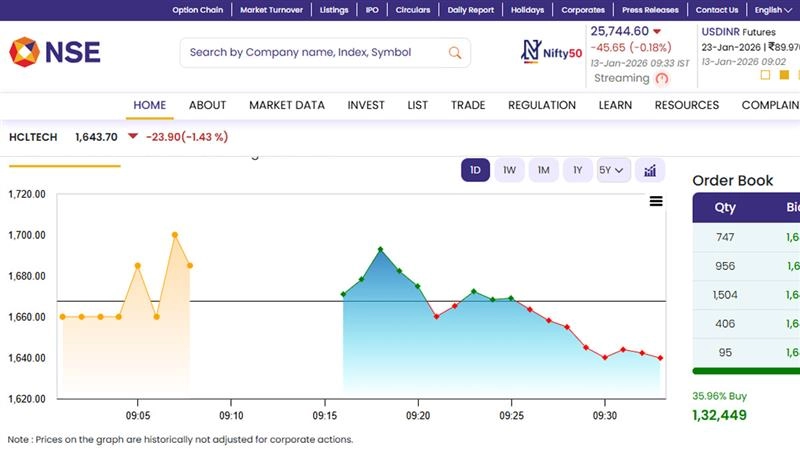 The share price of HCL Tech (NSE: HCLTECH) opened in the red on Tuesday, January 13, 2026. The HCL Technologies Limited (NSE: HCLTECH) stock was trading lower in early market hours on Tuesday, January 13, 2026. The stock was quoted at INR 1643.70, up INR 23.90 or 1.43%. The IT company reported on January 12 that its consolidated net profit for the December quarter declined by 11% year-on-year, totaling INR 4,076 crore compared to INR 4,591 crore from the same period last year. Stocks to Buy or Sell Today, January 13, 2026: TCS, HCL Technologies, and Biocon Among Shares That May Remain in Spotlight on Tuesday.