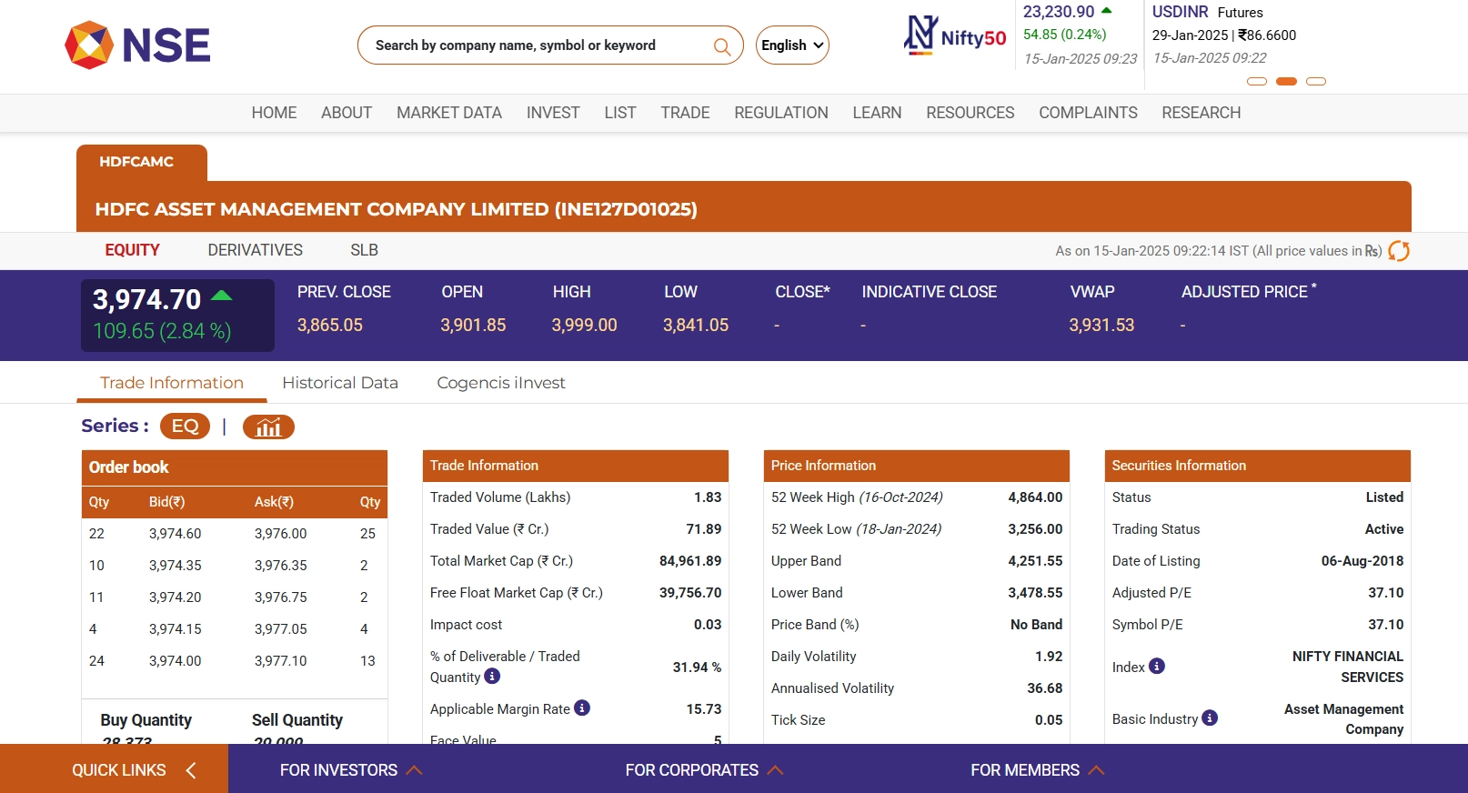 HDFC AMC share price (NSE: HDFCAMC) surged on January 15, trading at INR 3,974.70, up by INR 109.65 (2.84%) as of 9:26 AM IST. The stock is listed on both NSE and BSE, reflecting strong market sentiment. Investors are closely monitoring HDFC Asset Management Company due to its consistent performance and growth prospects in the asset management sector. Analysts attribute the rise to positive financial trends and investor confidence. For detailed updates, visit NSE or BSE official websites. Stocks To Buy or Sell Today, January 15, 2025: Adani Green, Sula Vineyards, Shoppers Stop Among Shares That May Remain in Focus on Wednesday.