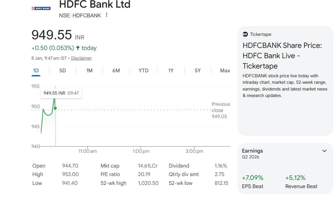 HDFC Bank Ltd share price (NSE: HDFCBank) were trading marginally higher in early trade on Wednesday, January 8. On the NSE, HDFC Bank stock was quoted at INR 949.70, up INR 0.65 or 0.07% at around 9:47 am IST. The stock opened on a steady note amid mixed cues from the broader market. Investors remain cautious ahead of upcoming quarterly earnings and commentary on loan growth, margins, and asset quality. Overall sentiment around the banking major stayed neutral in the morning session. Stocks to Buy or Sell Today, January 8, 2026: Infosys, Tata Steel and NCL Industries Among Shares That May Remain in Spotlight on Thursday.