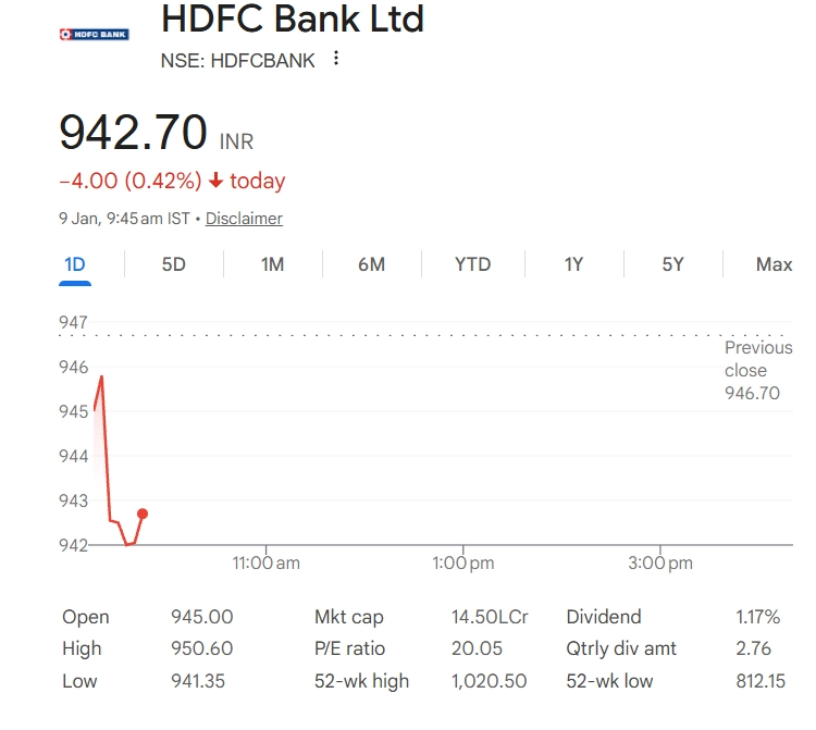 HDFC Bank Ltd (NSE: HDFCBank) shares traded lower in early deals on Thursday, January 9. The stock was quoted at INR 942.50 on the NSE, down INR 4.20 or 0.44% at 9:45 am IST. The mild decline comes as investors turn cautious ahead of the bank’s third-quarter earnings announcement scheduled for January 17. Market participants are closely watching asset quality, loan growth and margin trends, especially after recent volatility in banking stocks. Overall sentiment remains guarded in the near term. Stocks to Buy or Sell Today, January 9, 2026: RVNL, BHEL, and Vedanta Among Shares That May Remain in Spotlight on Friday.
