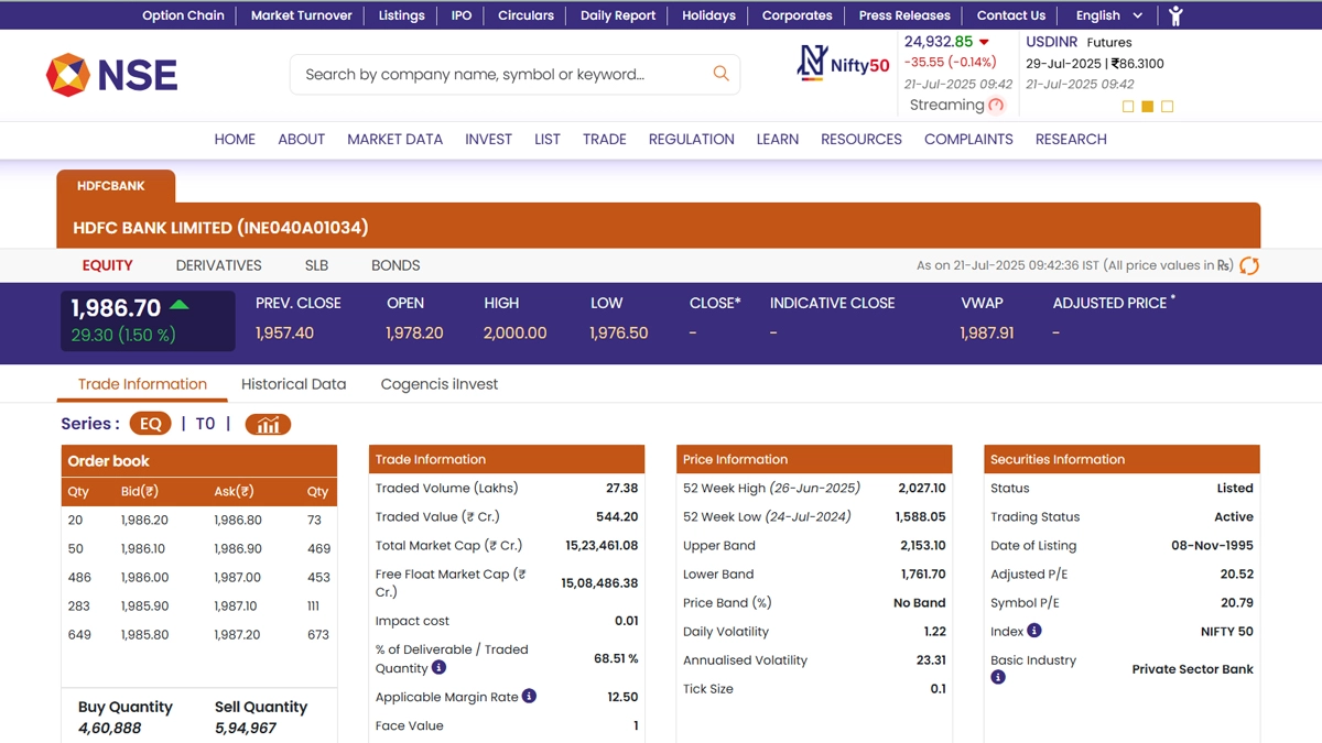 HDFC Bank Ltd (NSE: HDFCBANK) shares opened at INR 1,978.20 today, up from the previous close of INR 1,957.40. By 9:45 AM on Monday, July 21, the stock was trading at INR 1,986.70, marking a 1.5% gain. This surge follows the bank’s robust Q1 results, where net profit soared to INR 18,155 crore, surpassing analyst expectations. Net Interest Income (NII) increased 5.4% year-on-year to INR 31,438 crore, strengthening investor confidence. The announcement of a 1:1 bonus issue alongside a special interim dividend of INR 5 per share further boosted market sentiment. The stock remains well supported, trading near its 52-week high of INR 2,027.10. Stocks To Buy or Sell Today, July 21, 2025: Hitachi Energy India, NTPC, HCL Technologies Among Shares That May Remain in Focus on Monday.