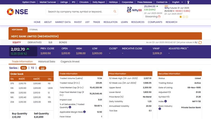 HDFC Bank Ltd (NSE: HDFCBANK) shares opened higher for the second straight session on Tuesday, July 22, at INR 2,013.10, compared to the previous close of INR 2,000.50. By 9:55 AM, the stock was trading at INR 2,012.70, up 0.61% in early trade. The upward momentum follows the bank’s strong Q1FY26 results, with net profit rising 12% YoY to INR 18,155 crore. Net interest income (NII) also grew 5.4% YoY to INR 31,438 crore, despite a marginal dip in net interest margin (NIM). The stock now trades close to its 52-week high of INR 2,027.10. Eternal (Zomato) Share Price Today, July 22: Eternal Ltd Stock Surges to INR 308.75 in Early Trade, Nears Upper Band After Q1 Revenue Jump; Check Latest Price on NSE.
