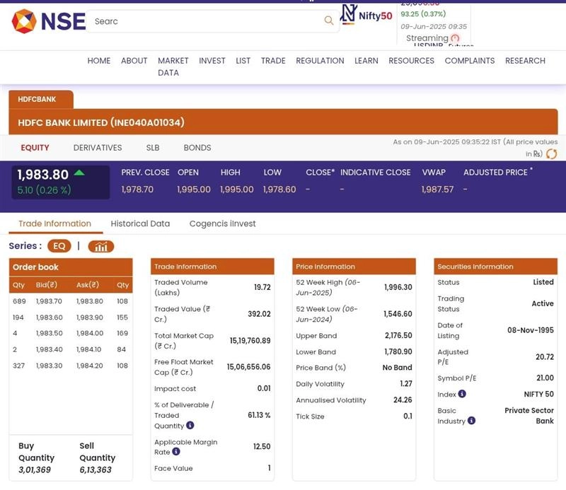 Stocks of HDFC Bank Limited (NSE: HDFCBANK) opened in green today, June 9, during the early morning trade. According to the National Stock Exchange (NSE) website, shares of HDFC Bank Limited (NSE: HDFCBANK) were trading at INR 1,983 and rose by INR 5.10, or 0.26%. On Sunday, June 8, the Mehta family filed an FIR against HDFC Bank's Managing Director and Chief Executive Officer (CEO) Sashidhar Jagdishan after the Lilavati Trust allegations. Stocks To Buy or Sell Today, June 09, 2025: Bharat Electronics, Asian Paints, Larsen & Toubro Among Shares That May Remain in Focus on Monday.