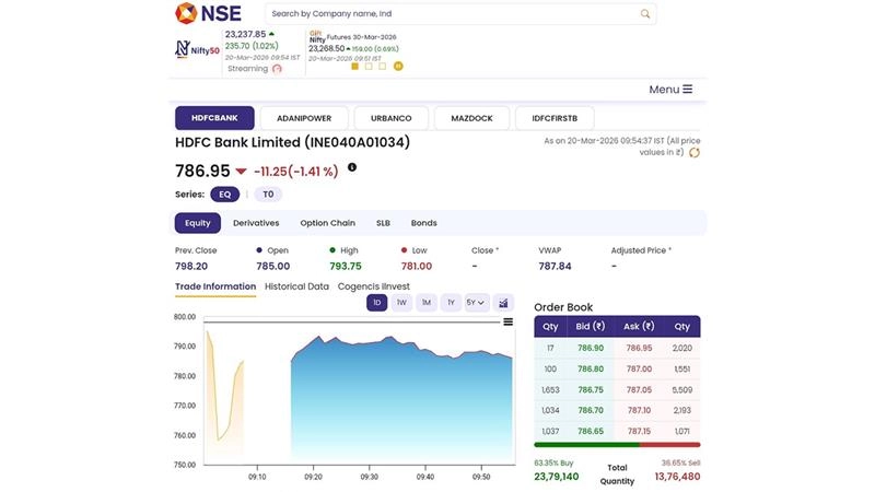 Shares of HDFC Bank Limited (NSE: HDFCBANK) opened in red as soon as business opened on Friday, March 20. HDFC Bank Limited (NSE: HDFCBANK) shares plunged as much as 1.41 percent to an intraday low of INR 786.95 on the National Stock Exchange (NSE) on Friday, March 20, a day after the resignation of the part-time chairman and independent director, Atanu Chakraborty. Keki Mistry, former CEO of HDFC, replaced Chakraborty as interim part-time chairman. Stocks To Buy or Sell Today, March 20, 2026: TCS, HDFC Bank, NTPC Among Shares Likely To Remain in Spotlight on Friday.