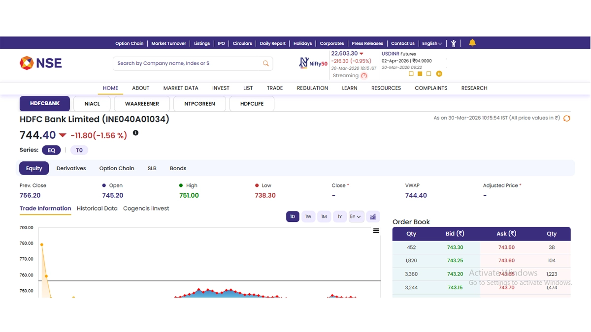 Shares of HDFC Bank Limited (NSE: HDFCBANK) opened in the red today, March 30, as soon as the stock market opened for business. According to the National Stock Exchange (NSE) website, stocks of HDFC Bank Limited (NSE: HDFCBANK) were trading at INR 744.40 and fell by INR 11.80 or 1.56 per cent. Notably, shares of HDFC Bank Limited (NSE: HDFCBANK) saw their 52-week high of INR 1,020.50 on October 23 last year and 52-week low of INR 738.30 today, March 30. Stocks To Buy or Sell Today, March 30, 2026: RailTel, Coal India, and JSW Steel Among Shares That May Remain in Spotlight on Monday.