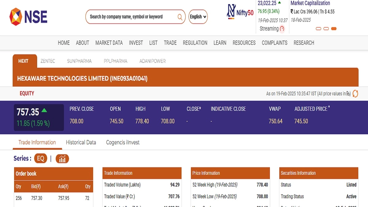 Hexaware Technologies Limited (NSE: HEXT) stocks opened in green in early trade today, February 19, as the stock market opened for business. Stocks of Hexaware Technologies Limited (NSE: HEXT) were trading at INR 757.35 and rose by INR 11.85 or 1.59 per cent on Wednesday. Notably, Hexaware Technologies Limited (NSE: HEXT) shares saw their 52-week high of INR 778.40 today. Zen Technologies Share Price Today, February 19: Stocks of Zen Technologies Limited Grow by 10% in Early Trade, Check Latest Price on NSE.