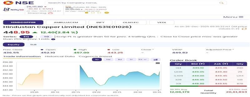 Shares of Hindustan Copper (NSE: HINDCOPPER) rose by 2.84% in early trade on Friday, December 26. The Hindustan Copper (NSE: HINDCOPPER) shares gained by INR 12.40 and were trading at INR 448.95 on December 26. On December 24, the closing prices of four stocks in the Nifty 500 pack rallied by more than 1% relative to their VWAP (Volume Weighted Average Price), and a shift above the VWAP suggests a potential bullish trend, according to Stockedge.com's technical scan data. Stock Market Today: Sensex Ends Flat, Nifty Inches Higher.