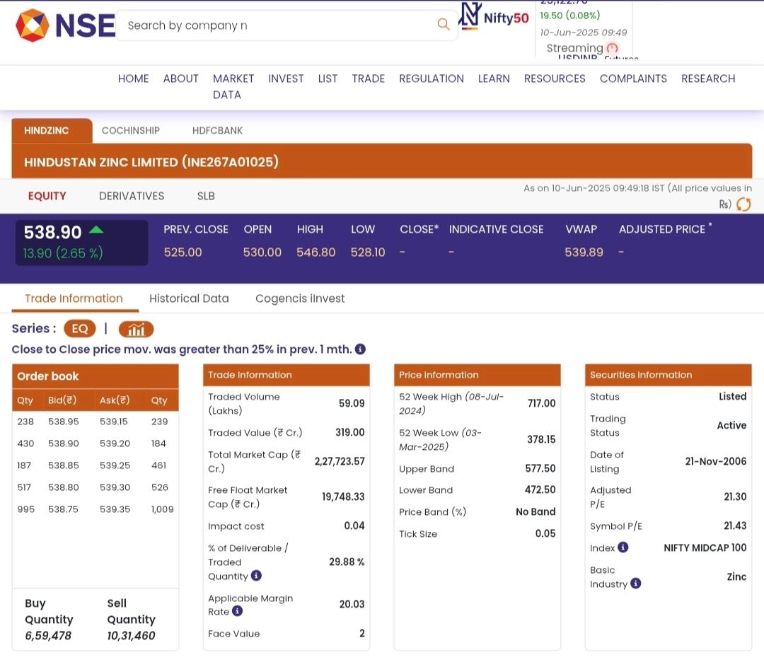 Stocks of Hindustan Zinc Limited (NSE: HINDZINC) opened in green today, June 10, during the early morning trade. According to the National Stock Exchange (NSE) website, shares of Hindustan Zinc Limited (NSE: HINDZINC) were trading at INR 538.90 and rose by INR 13.90 or 2.65%. Hindustan Zinc Limited is likely to annouce the first interim dividend for FY26 on June 11. Stocks To Buy or Sell Today, June 10, 2025: AstraZeneca Pharma, Capri Global and Premier Energies Among Shares That May Remain in Spotlight on Tuesday.