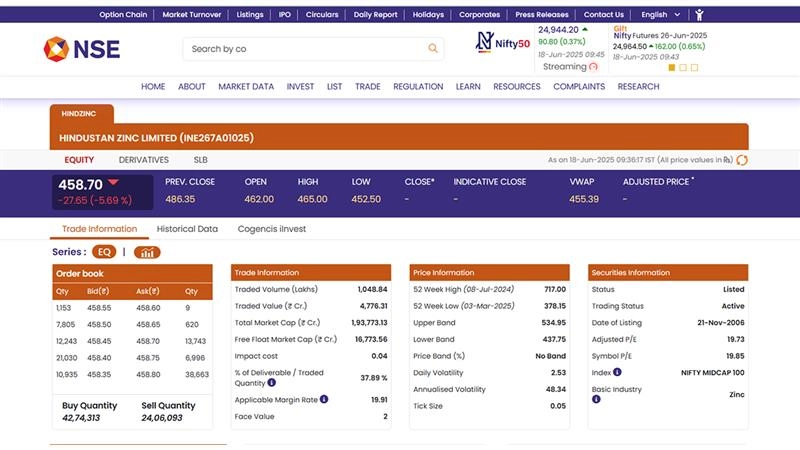 Shares of Hindustan Zinc Ltd (NSE: HINDZINC) tumbled over 5% in early trade on Wednesday, June 18, following reports of a major stake sale by promoter Vedanta Ltd. The stock opened at INR 462.00 and was trading at INR 458.70 by 9:45 AM, down by 27.65 points or 5.69% from the previous close of INR 486.35. The decline comes after reports emerged that Vedanta plans to sell shares worth up to INR 7,500 crore through block deals, possibly at a discount of up to 10% to the last closing price. DAM Capital and Citi are reportedly acting as brokers for the transaction, which may hit the market soon. The company’s 52-week high is INR 717.00 (July 8, 2024), while the 52-week low is INR 378.15 (March 3, 2025). The potential stake sale has triggered cautious sentiment among investors. Stocks To Buy or Sell Today, June 18, 2025: Tata Power, RailTel Corporation and Hindustan Zinc Among Shares That May Remain in Spotlight on Wednesday.