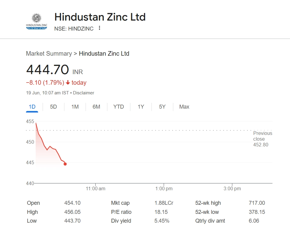 Hindustan Zinc Ltd share price (NSE: HINDZINC) declined by 1.68% to INR 445.20 on June 19 after promoter Vedanta Ltd sold a 1.71% stake via block deals on Wednesday. Around 7.2 crore shares were offloaded, with the total transaction size amounting to approximately INR 3,323 crore. The move is seen as part of Vedanta’s efforts to raise funds and pare down debt. The share sale led to selling pressure, impacting investor sentiment in early trade. Stocks To Buy or Sell Today, June 19, 2025: Bank of Maharashtra, Jio Financial Services and Hero MotoCorp Among Shares That May Remain in Spotlight on Thursday.