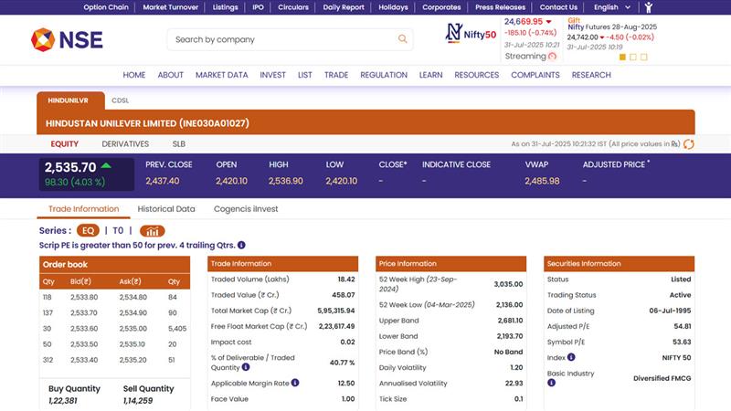 Hindustan Unilever Ltd (HUL) (NSE: HINDUNILVR) shares opened at INR 2,420.10 on Thursday, July 31, slightly below the previous close of INR 2,437.40. By 10:25 AM, the stock surged 4.03% to INR 2,535.70 following the company’s Q1 results. HUL reported a 4% volume growth and a 3.9% increase in revenue to INR 15,931 crore for the quarter. Net profit rose 7.7% year-on-year to INR 2,732 crore, while EBITDA declined marginally by 1.3% to INR 3,558 crore, slightly missing estimates. The stock is trading comfortably above its 52-week low of INR 2,136.00. CDSL Share Price Today, July 31: CDSL Stock Dips in Early Trade As Rival NSDL Launches INR 4,011 Crore IPO, Check Latest Price on NSE.
