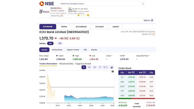 Shares of ICICI Bank Limited (NSE: ICICIBANK) witnessed a low opening on Monday, January 19, 2026, trading at approximately INR 1,370.70 during the early morning session. The shares of ICICI Bank Limited plunged by 2.84% on January 19. This drop comes after ICICI Bank Limited reported a mixed set of December quarter results, with its profit falling 4% year-on-year (YoY) due to one-off provisions. Stock analysts, however, maintained a 'Buy' rating on the stock, as they believe a fresh two-year term for MD & CEO Sandeep Bakhshi removed a key overhang on the counter. Stocks to Buy or Sell Today, January 19, 2026: HDFC Bank, Wipro and Reliance Industries Among Shares That May Remain in Spotlight on Monday.