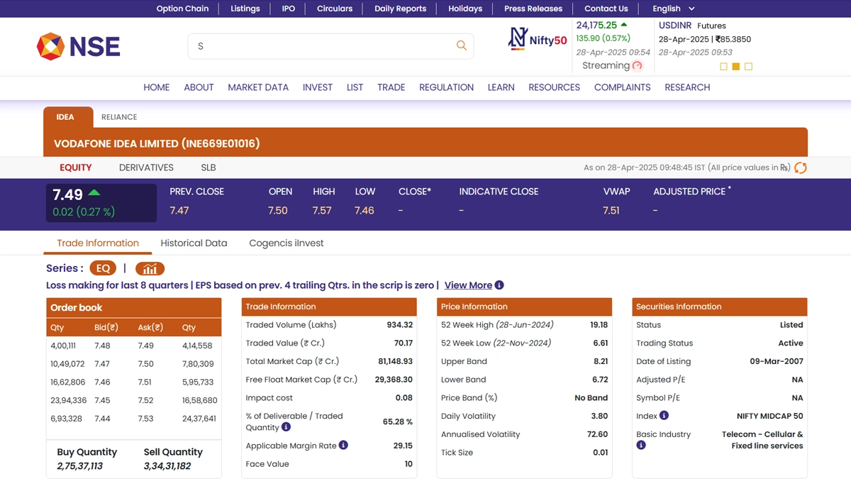Shares of Vodafone Idea Ltd (NSE: IDEA) rose 0.27% today, April 28, trading at INR 7.49, up from the previous close of INR 7.47. The uptick follows a significant development on Friday, April 25, when Goldman Sachs acquired nearly 60 crore shares of the telecom company in a block deal. The shares were purchased at an average price of INR 7.65 per share, attracting attention from market participants. Despite Vodafone Idea's debt challenges, the deal has sparked investor interest, as the stock remains well below its 52-week high of INR 19.18. Analysts are watching the stock closely for any further movements, given the large transaction. Reliance Share Price Today, April 28: Reliance Industries Stock Climbs 2.8% After Reporting Strong Q4FY25 Results.