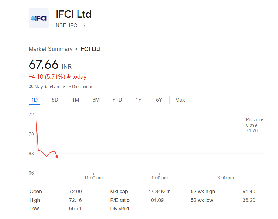 IFCI share price (NSE: IFCI) declined sharply in early trade on May 30, falling by 5.71% to INR 67.66 on the NSE as of 9:54 am IST. The drop of INR 4.10 comes amid broader market weakness and profit booking by investors. The stock, which has recently seen strong upward momentum, faced resistance at higher levels. Analysts suggest cautious trading as volatility persists, with further cues awaited from macroeconomic data and market sentiment. Suzlon Energy Share Price Today, May 26: Stocks of Suzlon Energy Limited Rise by 4.42%, Check Latest Price on NSE.