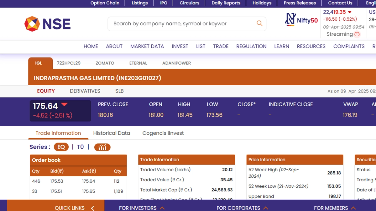Indraprastha Gas Limited (NSE: IGL) shares opened on a negative note today, April 9. According to the latest trading developments, stocks of Indraprastha Gas Limited (NSE: IGL) were trading at INR 175.64 and fell by INR 4.52 or 2.51 per cent. Notably, Indraprastha Gas Limited (NSE: IGL) saw its 52-week high of INR 285.18 on September 2 last year and 52-week low of INR 153.05 on November 21, 2024. Eternal (Zomato) Share Price Today, April 9: Stocks of Eternal Limited Fall by INR 3.46 in Early Trade, Check Latest Price on NSE.