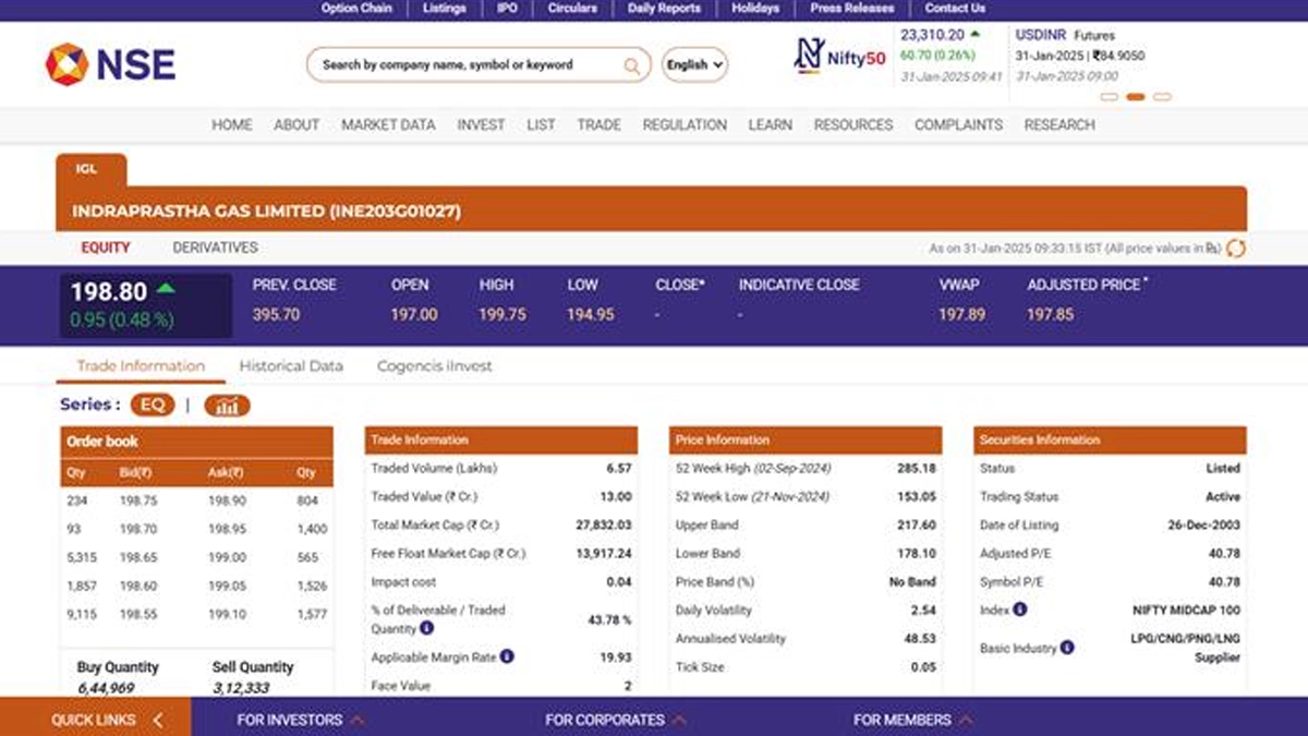 Shares of Indraprastha Gas Limited (IGL) (NSE: IGL) saw a slight uptick on Friday, trading at INR 198.80, up 0.48 per cent, ahead of its 1:1 bonus issue. The stock opened at INR 197 after closing at INR 395.70 in the previous session, reflecting adjustments due to the bonus issuance. With the record date set for January 31, investors are closely monitoring the stock’s movement. In a previous filing, IGL confirmed that eligible shareholders will receive the bonus shares on February 3. The company had earlier announced the approval of the bonus issue through official letters in December 2024 and January 2025. Stocks To Buy or Sell Today, January 31, 2025: Bank of Baroda, JSW Steel and Torrent Power Among Shares That May Remain in Spotlight on Friday.