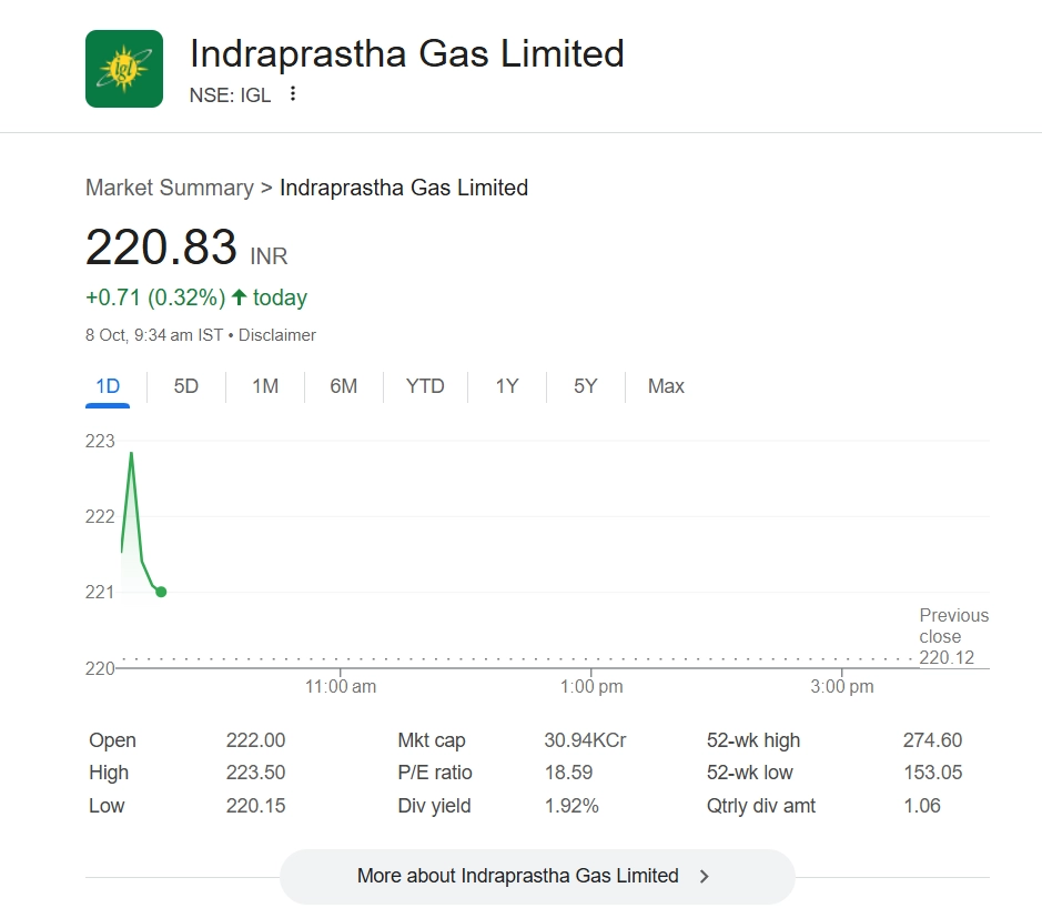 Indraprastha Gas Ltd share price (NSE: IGL) opened at INR 221.20 on October 8, 2025, and was trading at INR 221.04, up INR 0.92 (0.42%) as of 9:37 AM IST. The stock’s day range was INR 220.15–INR 223.50, with a 52-week range of INR 153.05–INR 271.85. Investor optimism is fueled by reports suggesting that a potential reduction in VAT on natural gas could significantly boost margins for city gas distributors. Nomura projects a 22% EBITDA increase for IGL if the tax cut is implemented. Despite recent volatility, IGL remains a key player in the city gas distribution sector, with a market capitalisation of INR 30,818 crore. Stocks To Buy or Sell Today, October 8, 2025: Tata Motors, Titan and Lodha Developers Among Shares That May Remain in Spotlight on Wednesday.