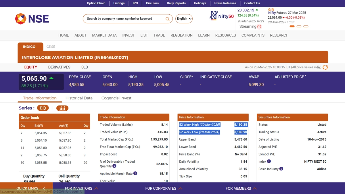Shares of InterGlobe Aviation Ltd. (NSE: INDIGO) climbed 1.71 per cent in early trade on March 20, reaching INR 5,065.90 against the previous close of INR 4,980.55. The stock on Wednesday, March 19, hit a record high of INR 5,053.05, driven by strong passenger growth expectations for Q4FY25. IndiGo plans to expand aggressively, adding one aircraft per week until 2030, targeting a fleet of over 600 aircraft. The airline also aims to increase its international capacity share from 25 per cent to 40 per cent in the coming years. Additionally, plans to introduce widebody aircraft from FY25 and XLRs from FY26 will support its long-haul expansion strategy. Investors remain bullish as IndiGo strengthens its position in the global aviation market. GRSE Share Price Today, March 20: GRSE Stock Jumps 3% After PSU Defence Firm Signs First-Ever MoU With Nagaland Government.