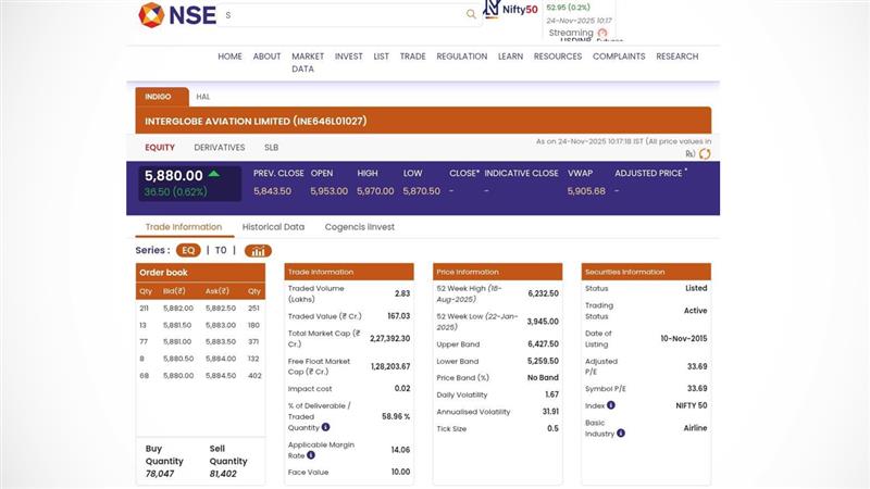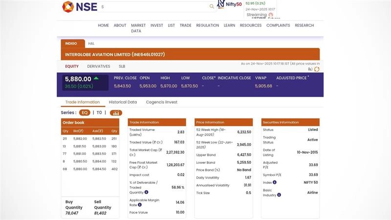 Shares of IndiGo’s parent company, InterGlobe Aviation, rose by over 1 percent in the early trading hours of Monday, November 24, after BSE Index Services announced that the company will be added to the 30-stock Sensex benchmark. InterGlobe Aviation will replace Tata Motors Passenger Vehicles in the index, with the change scheduled to take effect from the market opening on Monday, December 22. Stocks to Buy or Sell Today, November 24, 2025: Tata Power, RVNL and Lemon Tree Hotels Among Shares That May Remain in Focus on Monday.