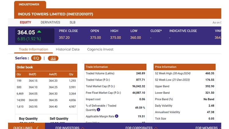 Indus Towers share price (NSE:IndusTower) soared over 5% on December 5, reaching INR 364.05 in early trade on the NSE, marking its third consecutive session of gains. This rise followed Vodafone Plc’s announcement of selling its remaining 3% stake in the telecom infrastructure company for INR 2,802 crore via a block deal. The sale has boosted investor sentiment, pushing Indus Towers’ market capitalisation past INR 95,900 crore. Vodafone Plc stated it would use the proceeds to repay debt. Additionally, Vodafone Idea shares climbed 4.5% to INR 8.79 on the BSE, while rival Bharti Airtel rose 1% to INR 1,602.45. The equity benchmarks Sensex and Nifty also edged up 0.2% in morning trade. The Indus Towers share price (NSE:IndusTower)momentum reflects optimism surrounding the deal and its positive impact on market dynamics. Adani Group Share Price Today, December 4: Check Share Prices of Adani Power, Adani Ports, Adani Enterprises, Adani Green Energy on NSE and BSE.