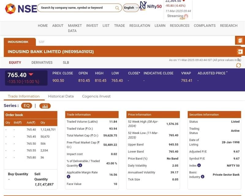 Stocks of Indusind Bank Limited (NSE: INDUSINDBK) opened in red today, March 11, during the early morning trade. According to the National Stock Exchange (NSE) website, shares of Indusind Bank Limited (NSE: INDUSINDBK) were trading at INR 765.40 and dropped by INR 135.10, or 15%. On Tuesday morning, Sensex declined 379.79 points to 73,735.38 in early trade, while Nifty slipped 108.40 points to 22,351.90. Stocks To Buy or Sell Today, March 11, 2025: Hindustan Zinc, MSTC, IndusInd Bank and Bharat Electronics Among Shares That May Remain in Focus on Tuesday.